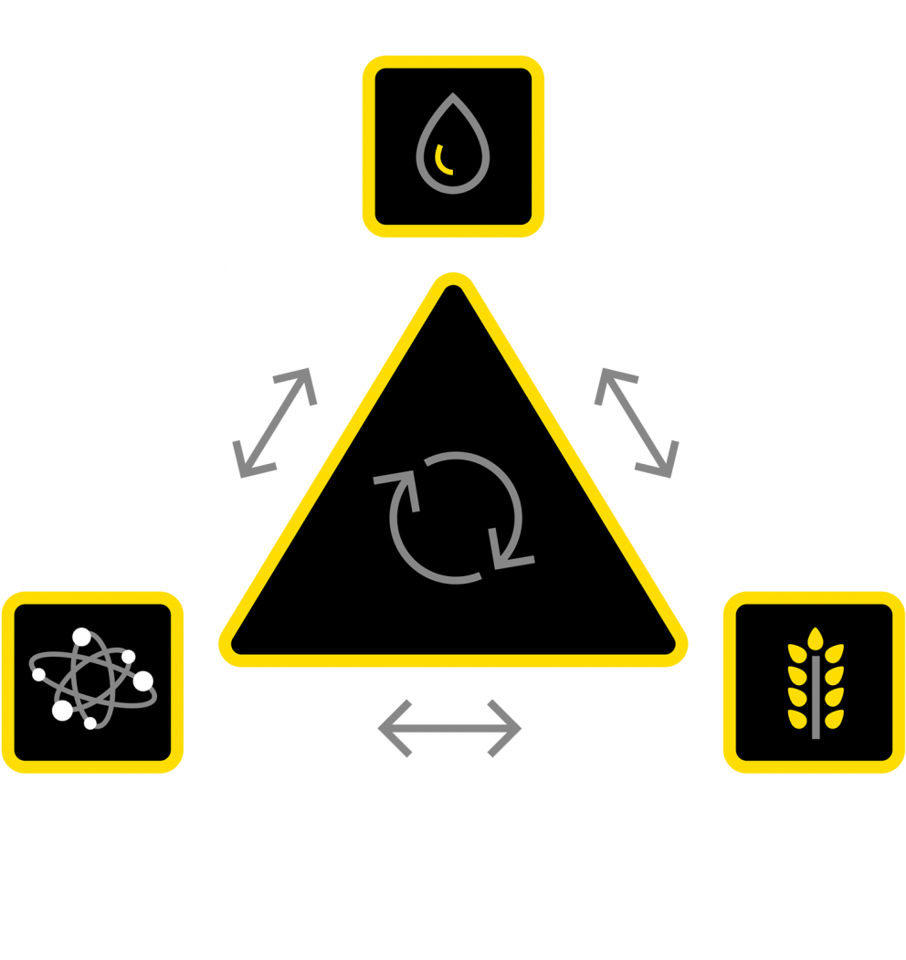El nexo alimentos-agua-energía muestra la relación entre las tres partes de una comunidad sostenible.